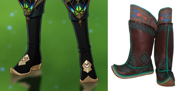 アルハイゼンの履いている膝丈の先のとがったブーツはモンゴルで履かれていたゴタルと呼ばれる系統のもので、このブーツは元々は仏教・ラマ教圏で登場し、後に中東やエジプトでも広まりました。