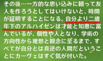 アルハイゼンそのもの年齢に関する言及はありませんが、カーヴェの2歳下であることが分かっています。