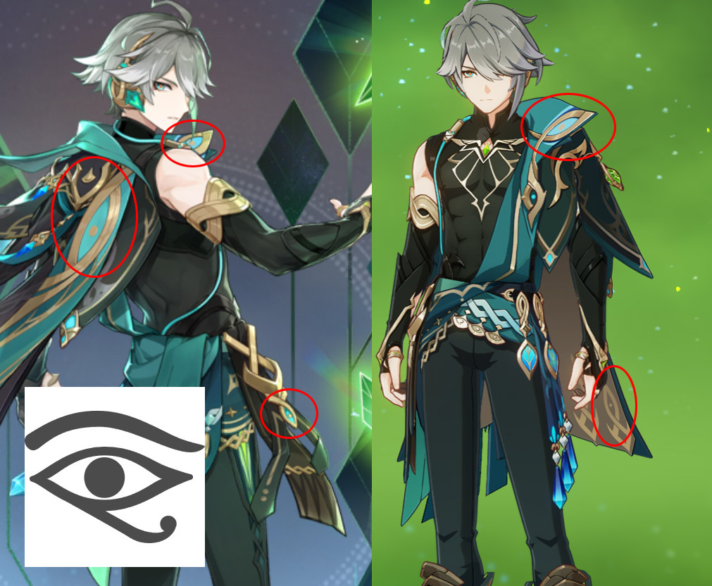 アルハイゼンのデザインで一番目を引くのは、全身にふんだんにあしらわれたホルスの目(或いはウジャトの目)ですね。